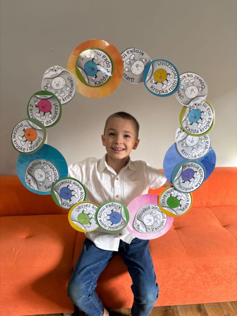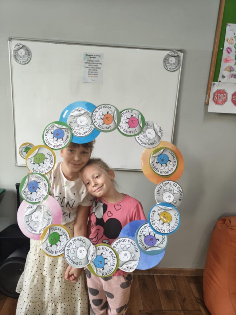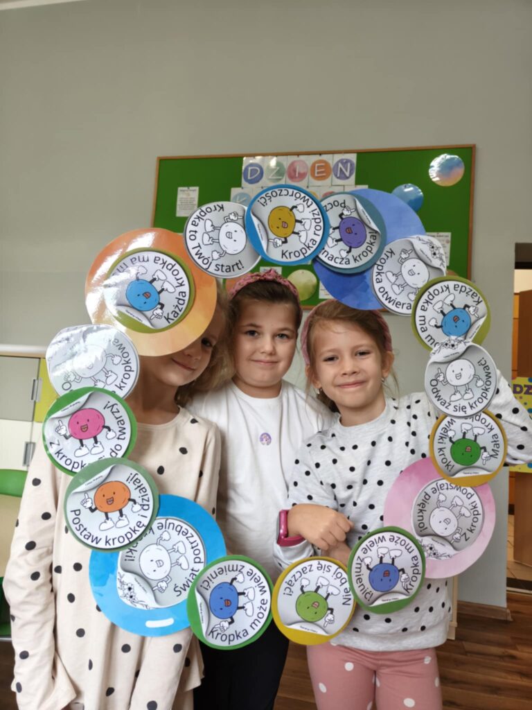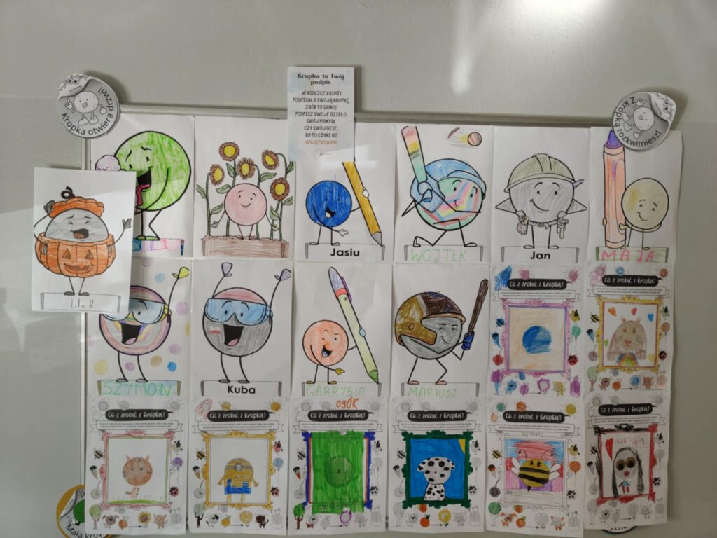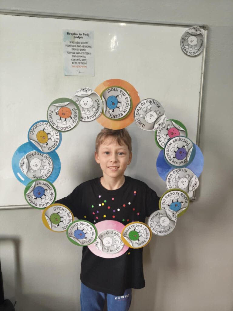 Uczniowie w czasie zajęć poznali historię powstania tego nietypowego święta. Opowiadanie „The Dot” , którego bohaterką jest mała Vashti (nieśmiała dziewczynka, która nie wierzyła w swoje możliwości), poruszyło naszych świetliczaków. Dzieci miały możliwość zaprezentowania swoich talentów oraz wzięcia udziału w zabawach rozwijających kreatywność. Powstały przepiękne kropkowe prace plastyczne.