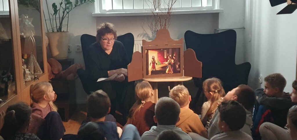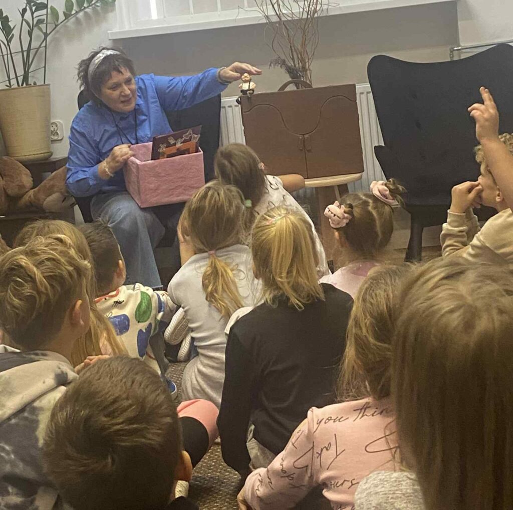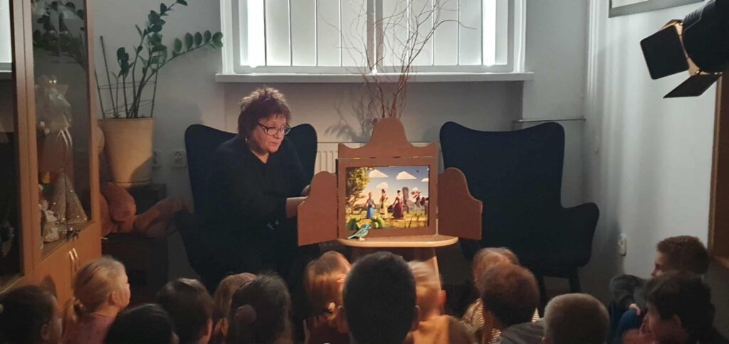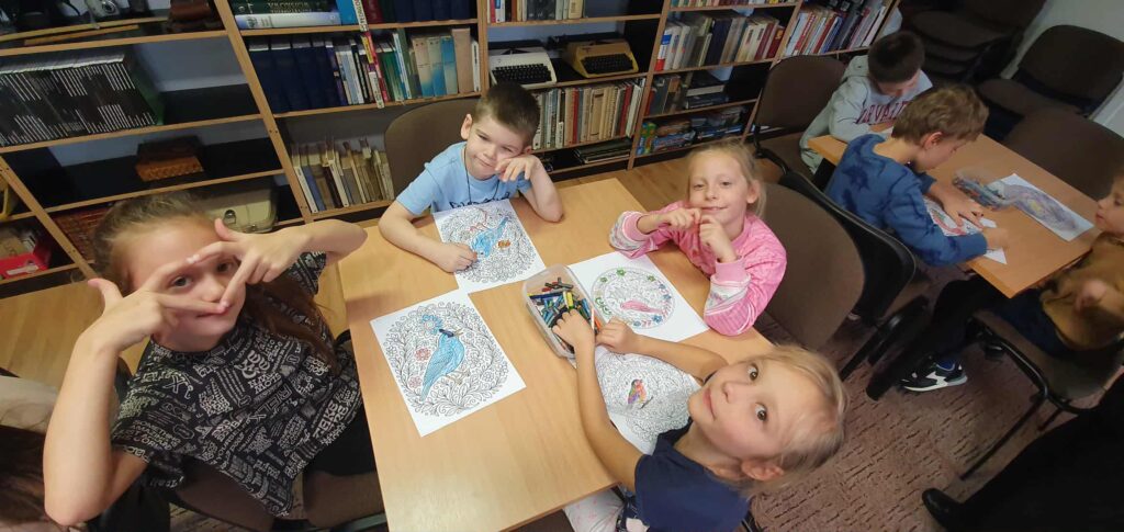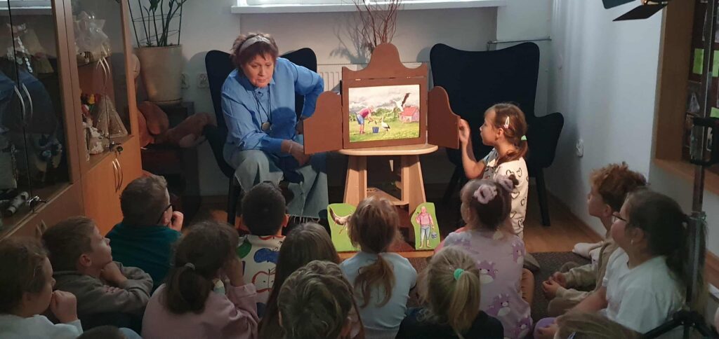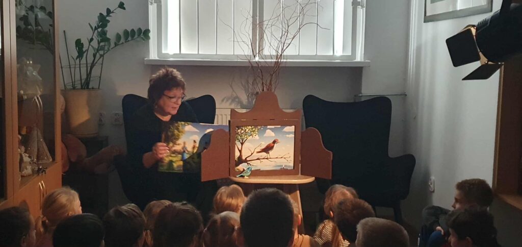 Uczniowie klasy 1cwzięli udział w zajęciach bibliotecznych opartych na bajce „Słowik” H. Ch. Andersena, z wykorzystaniem teatrzyku Kamishibai. Po wysłuchaniu opowieści dzieci brały udział w różnorodnych grach i zabawach: odpowiadały na pytania dotyczące treści bajki (prawda czy fałsz), odgadywały tytuły znanych baśni po rekwizytach i rysunkach, rozwiązywały zagadki związane z książkami oraz kolorowały ilustracje przedstawiające postacie z bajki o słowiku.