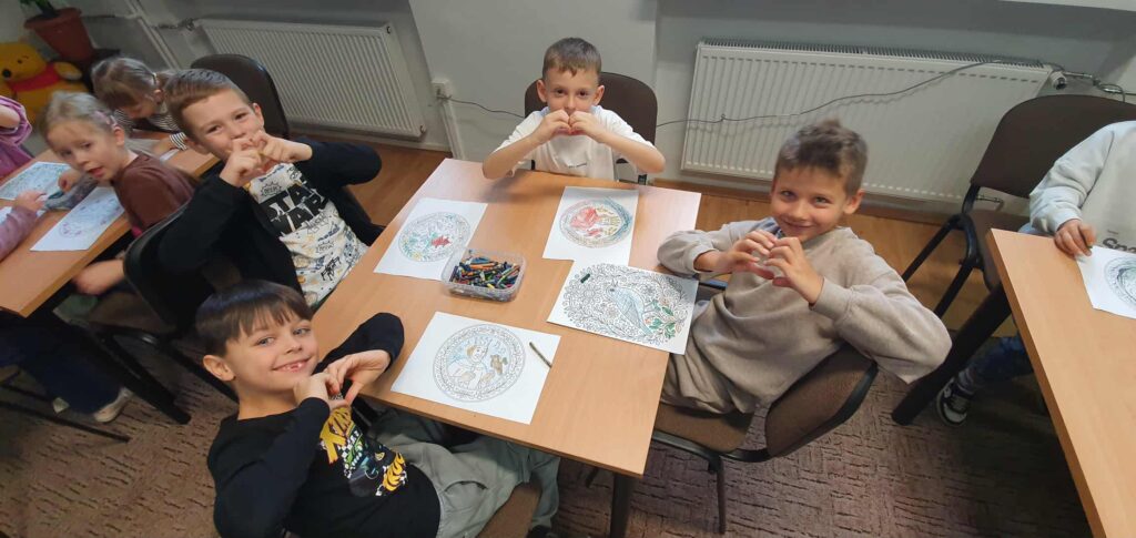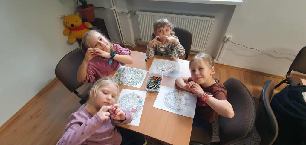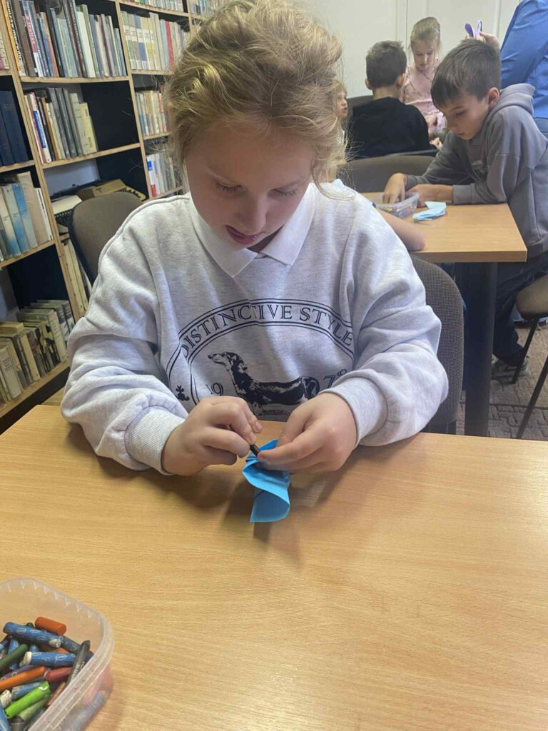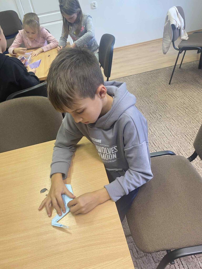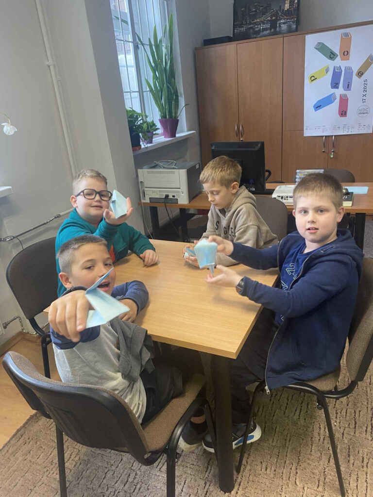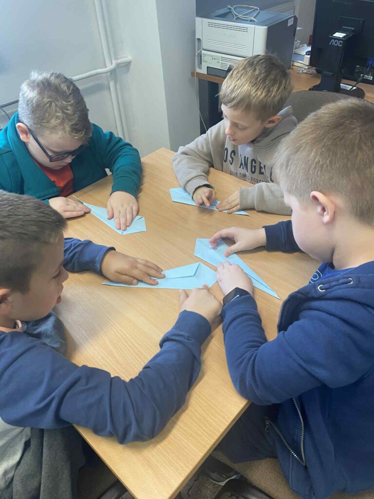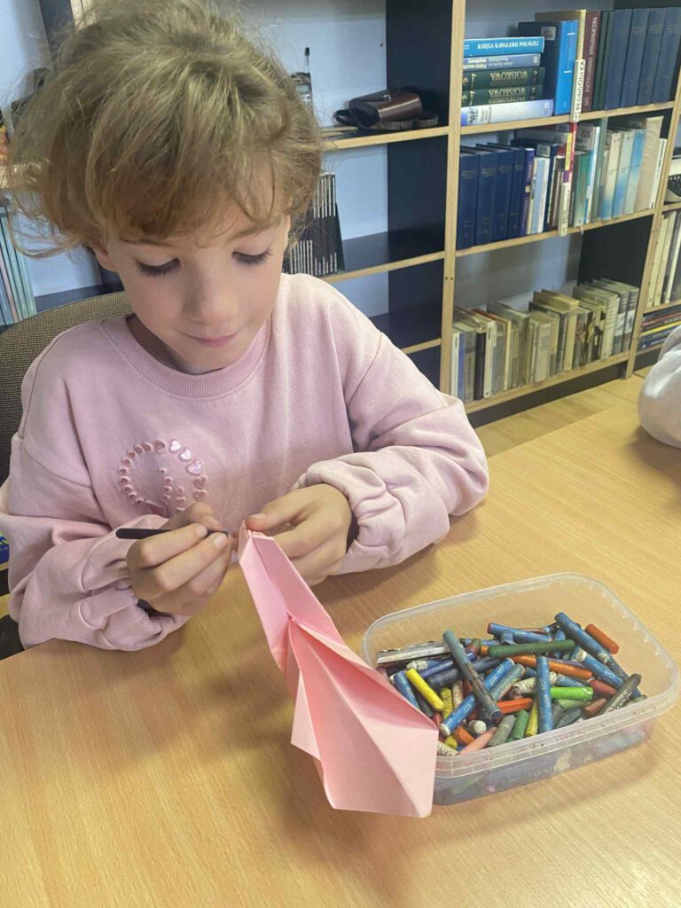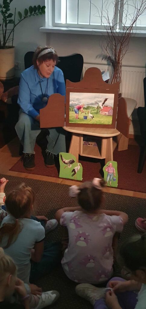 Natomiast uczniowie klasy 2cuczestniczyli w zajęciach opartych na bajce terapeutycznej „Bociany – Klepatan i Malena”, również przedstawionej w formie teatrzyku Kamishibai. Po wysłuchaniu historii rozmawiali o jej treści i przesłaniu – że można być szczęśliwym pomimo niepełnosprawności. Dzieci rozwiązywały zagadki tematycznie związane z książką, odgadywały tytuły bajek po rekwizytach i rysunkach oraz wykonały z papieru origami bociana.