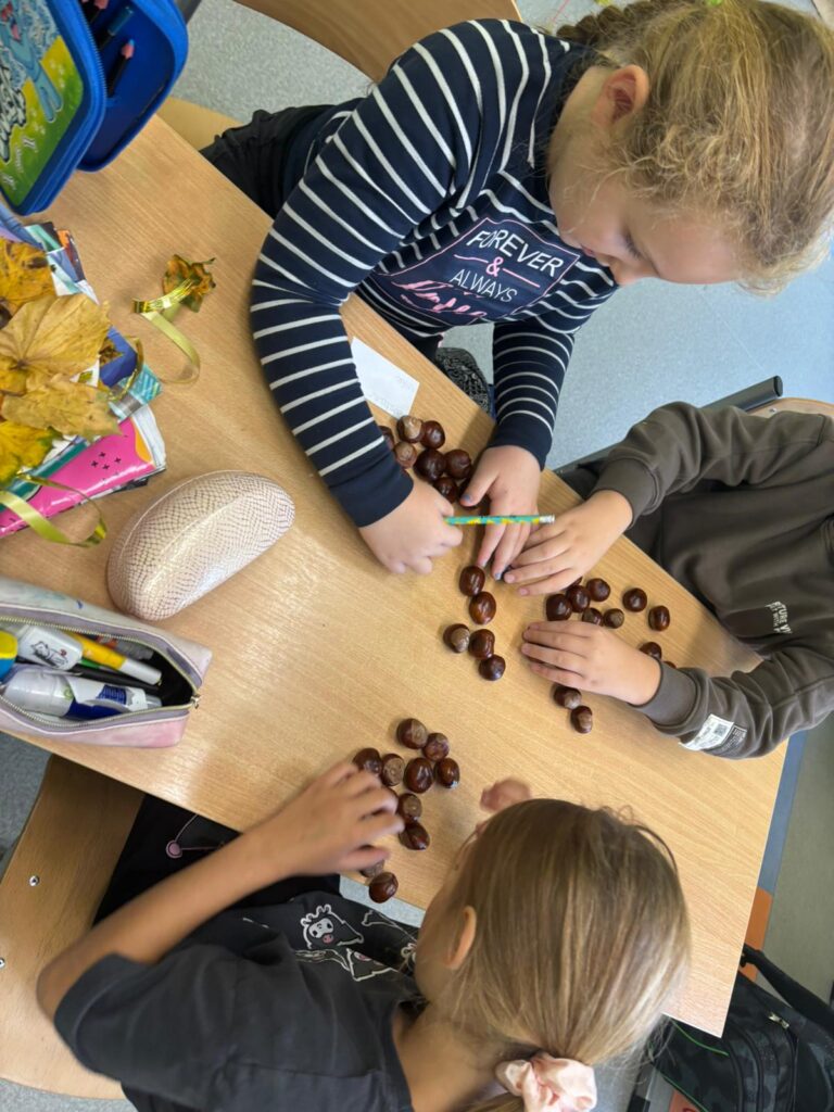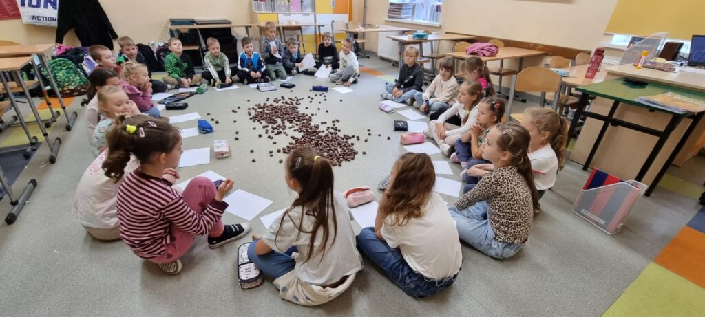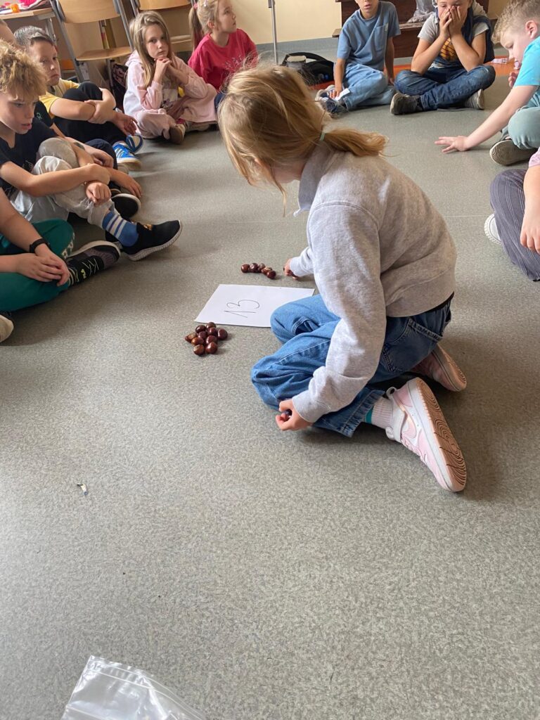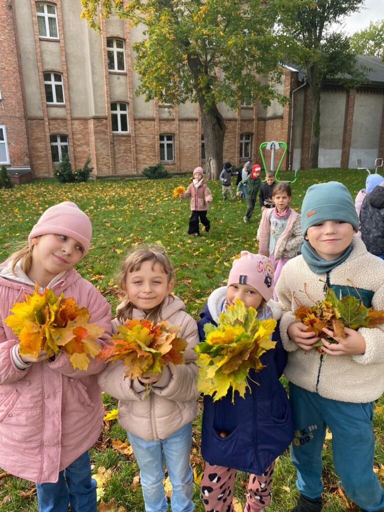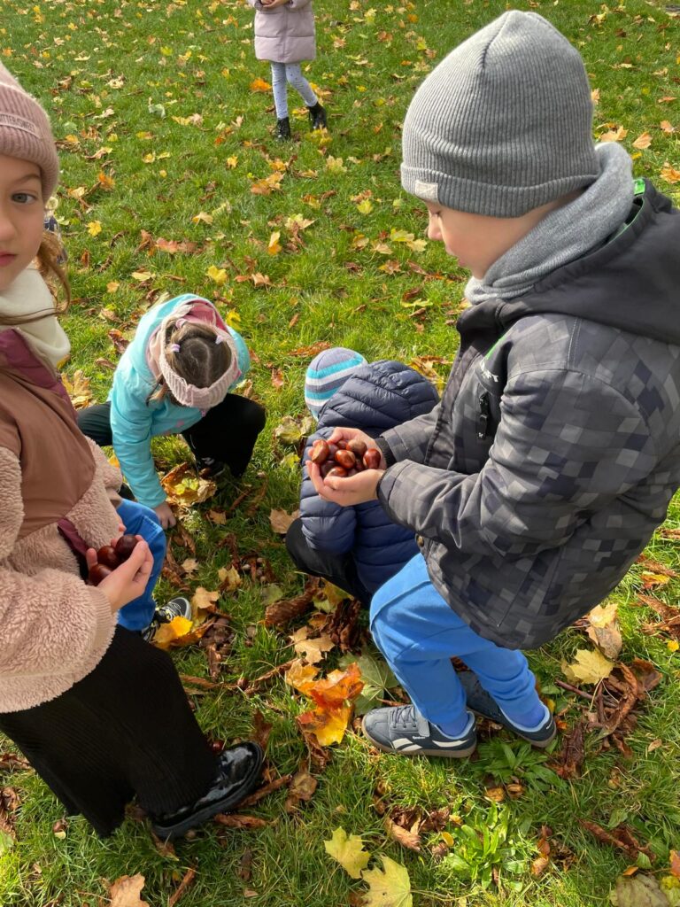 Czwarty dzień Zmagań Przyrodniczo – Matematycznych spędziliśmy wyjątkowo – na jesiennym spacerze! Wszystkie klasy wyruszyły w teren, by w praktyce połączyć przyrodę z matematyką. Uczniowie najpierw zbierali liście i kasztany, a następnie je segregowali i przeliczali. To była doskonała okazja, by uczyć się poprzez zabawę i jednocześnie cieszyć pięknem złotej, polskiej jesieni.