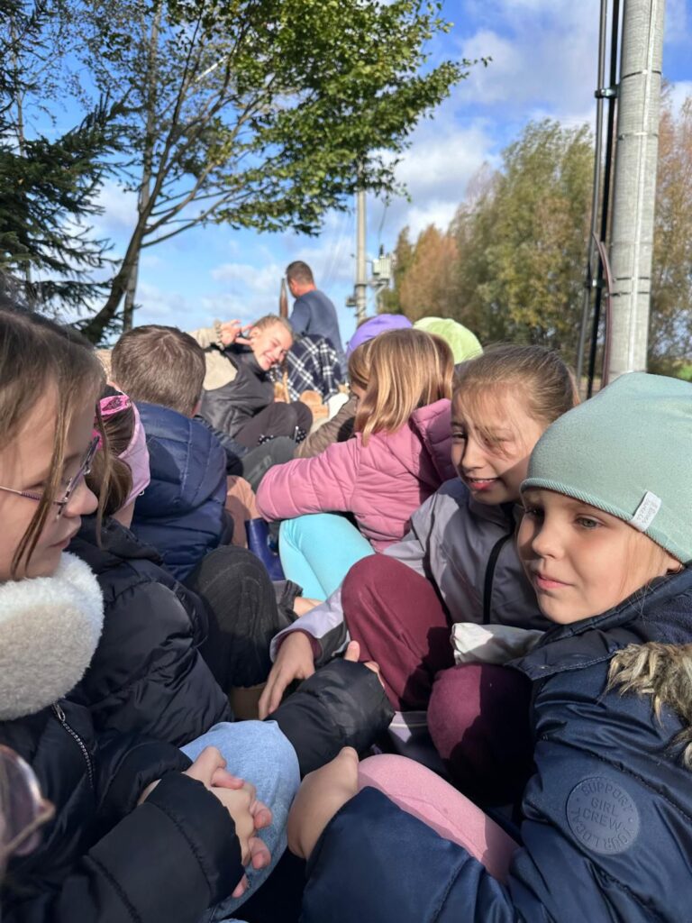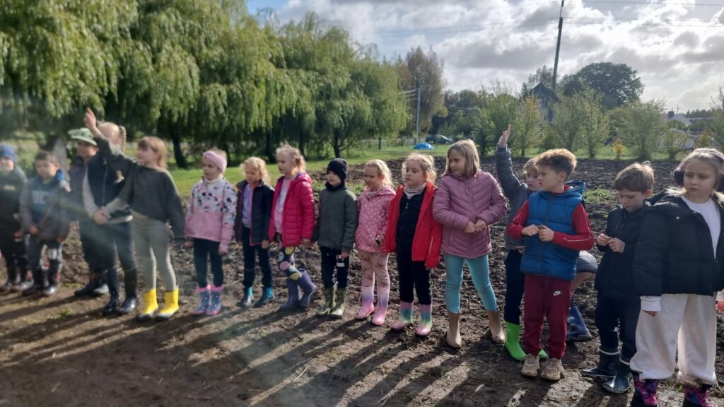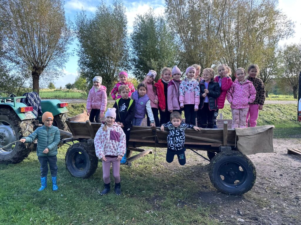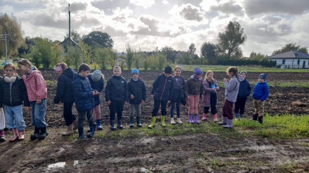 Podczas pobytu dzieci poznały historię ziemniaka oraz dowiedziały się, jak wyglądały dawne prace w gospodarstwie. Uczniowie mieli okazję przejechać się starym wozem, spacerować po polu i samodzielnie oddzielać ziemniaki od ziemi. Nie zabrakło również smakowitej atrakcji – wszyscy z apetytem zajadali się pieczonymi ziemniakami prosto z ogniska.